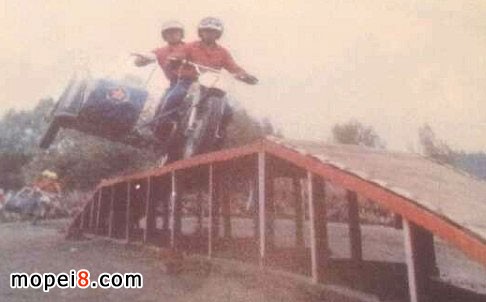 通過反橋壁的駕駛要領(lǐng)是:在距反橋壁25m處校正方向,對準(zhǔn)反橋壁,采取半蹲駕駛姿勢,使用二擋,加油沖速(車速控制在40km/h)。當(dāng)前輪越過反橋壁躍起的剎那間,駕駛員借助腰部、臂部的力量,用力提把;以此同時(shí),副手站在靠機(jī)車一側(cè),兩臂用力向后拉邊車上部橫梁,以提高前輪的仰角,使后輪先著地。當(dāng)車輛躍起時(shí),可完全關(guān)閉油門,但在摩托車著地之前或著地的同時(shí),應(yīng)及時(shí)加油。實(shí)踐證明,這樣做車輛著地時(shí)的穩(wěn)定性比較好,能避免前減震器因先著地承受巨大重力而損壞,或方向把嚴(yán)重?cái)[動影響穩(wěn)定性,也不會因前輪仰角過大而引起縱向傾覆。因?yàn)椋?dāng)前輪提到一定的高度,落地時(shí)邊斗的尾部鋼管必然支承地面。