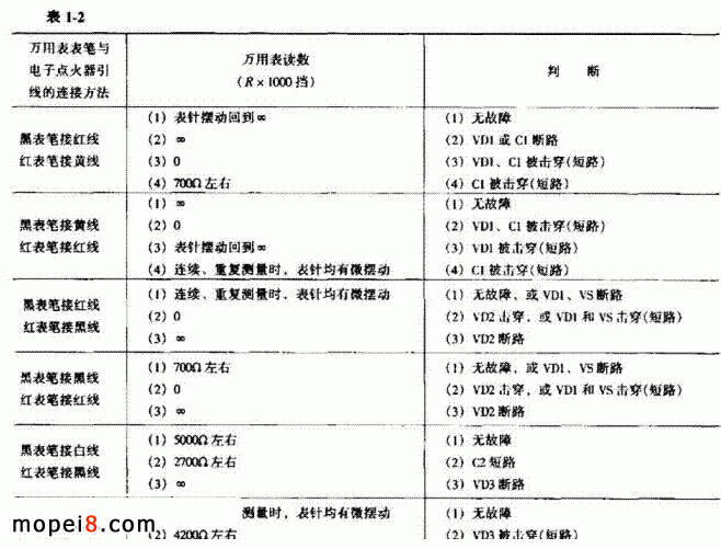 5. 電子點(diǎn)火器的檢查如圖 1-72 所示為典型的電子點(diǎn)火系統(tǒng)電路圖。用萬用表電阻擋測(cè)量電子點(diǎn)火器各引出線之間的電阻值,根據(jù)測(cè)出的數(shù)值即可判斷電子點(diǎn)火器有無故障。測(cè)量時(shí)的接線方法和判斷結(jié)論見表 1-2 。