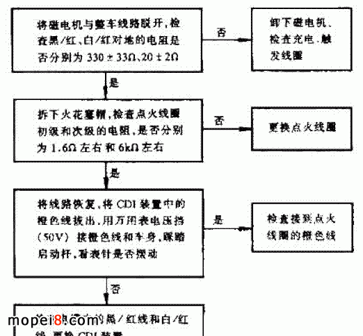 2. 故障原因( 1 )點火電源線圈及其引出線(黑 / 紅)斷路或短路。( 2 )觸發(fā)線圈及其引出線(白 / 紅)斷路或短路。( 3 ) CDI 點火裝置損壞。( 4 )電纜中黑 / 紅、白 / 紅或橙色線斷路或短路。( 5 )點火線圈損壞。( 6 )火花塞積碳嚴(yán)重。