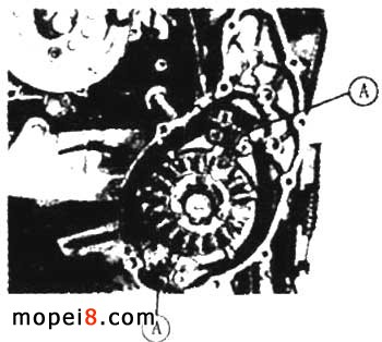 ( 1 )卸下左箱蓋側面的曲軸孔塞及上面的標記觀察塞,卸掉火花塞及缸頭蓋。用套筒扳手插進曲軸孔塞處,旋轉磁電機轉子(即曲軸)、使左箱蓋上的箭頭指向磁電機轉子外圓上的刻度線,如圖 1-4 所示。缸 1 上配氣凸輪旋轉至圖 1-5 位置,如配氣凸輪不在圖 1-5 位置,繼續旋轉曲軸 360° ,仍然左箱蓋箭頭與轉子刻度對齊,此時可測量缸 1 的進、排氣門間隙。