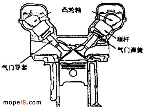 1. 曲軸轉過 0° (或 2nπ )~ 180° 范圍內 第一缸:活塞 8 從上止點移動到下止點,進氣門 9 開啟,活塞移動產生的負壓(吸力)將化油器霧化好的可燃混合氣吸入,排氣門 4 關閉。凸輪軸轉過 90° 角(因曲軸上主動配氣鏈輪齒數與凸輪軸上從動配氣鏈輪齒數為 1 : 2 )第一缸完成進氣沖程。 第二缸:活塞 5 從下止點移動到上止點,排氣門 3 開啟,進氣門 10 關閉,強制排氣。第二缸完成排氣沖程。