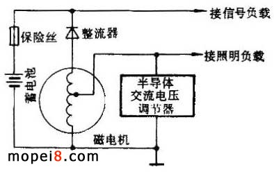 一、獨立線圈式 將磁電機線圈繞成夜間和晝間用線圈。在夜間行駛時,由夜間用線圈向照明負載和信號負載供電。中間抽頭為晝間用線圈,白天行駛時向信號負載供電。電路如圖 2 所示。