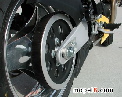 可用三種基本方式將發動機功率傳遞給摩托車后輪:鏈條、皮帶或軸。鏈條主減速器系統是目前最常用的方式。在此系統中,將安裝在輸出軸上的鏈輪(即變速器中的軸)連接到通過金屬鏈附加在摩托車后輪的鏈輪上。變速器轉動較小的前部鏈輪時,沿著鏈條將功率傳遞給更大的后部鏈輪,然后轉動后輪。這類系統必須潤滑和調整,且由于鏈條伸長和鏈輪磨損,還需定期更換。