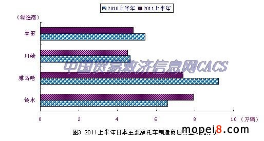 統(tǒng)計(jì)顯示,日本2011年上半年摩托車出口額共計(jì)23.8691億美元,與2010年同期的23.9209億美元相比,減少了517萬(wàn)美元,同比下降了0.2%。其中整車出口額共計(jì)16.3275億美元,零部件出口額為7.5416億美元。