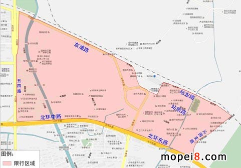 具體限行區域為:五四路(南起五四路北環中路路口,北至五四路東浦路路口,不含本道路)以東,東浦路、站前路、站東路(西起東浦路五四路路口,東至站東路沁園支路路口,含本道路)以南,沁園支路(北起沁園支路站東路路口,南至沁園支路北環東路路口,不含本道路)以西,北環東路、北環中路(東起北環東路沁園支路路口,西至北環中路五四路路口,不含本道路)以北。
