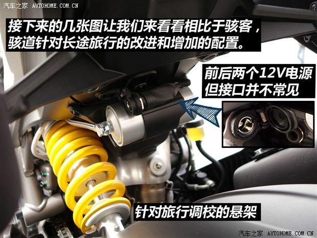 而其他的主要變化還有延長了的保養里程(增長到15000km,不過我認為沒有什么實際意義,因為摩托車在中國并非代步工具,1年騎1萬公里是很少見的,而每年換次機油是最起碼的了);DESMO氣門調節從15000km延長到了30000km;增大的油箱(從12.5升增長到16升,這項改變是極好的!頻繁加油對我來說是很煩的一件事。而且長途旅行能達到的范圍也更遠了)。