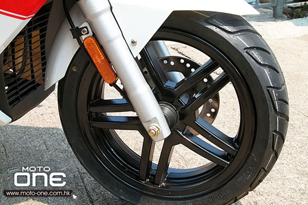 前后均是13吋輪框,前為兩活塞煞車卡鉗配鉆孔煞車碟。