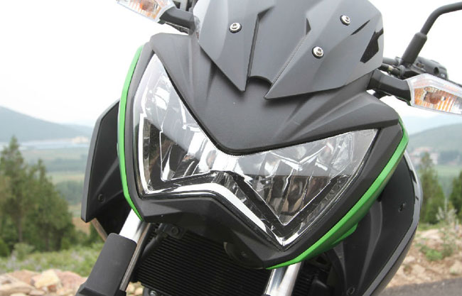 Z 250在整體風(fēng)格上延續(xù)了Z系列的硬朗格調(diào),車身線條所營(yíng)造的肌肉感酷似本家大哥和二哥,又多了幾分小排量車特有的輕靈。層次分明的車頭包括蝴蝶狀大燈和犀利的上部小面罩,利落之中透著兇悍,至于那只面罩到底是實(shí)用還是擺設(shè),只能見(jiàn)仁見(jiàn)智嘍。