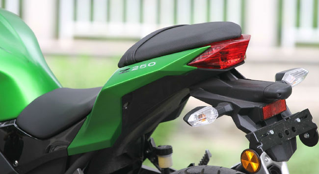 在制動(dòng)系統(tǒng)的配置上,Z 250絕對(duì)是可圈可點(diǎn)——前后制動(dòng)盤均為散熱能力較強(qiáng)的花瓣式,而前后制動(dòng)卡鉗也都是雙活塞,完全能夠跟以“運(yùn)動(dòng)”著稱的Ninja 250R相提并論了。140/70-17的后輪規(guī)格,對(duì)這個(gè)級(jí)別的車款來(lái)說(shuō)應(yīng)該是恰到好處了。