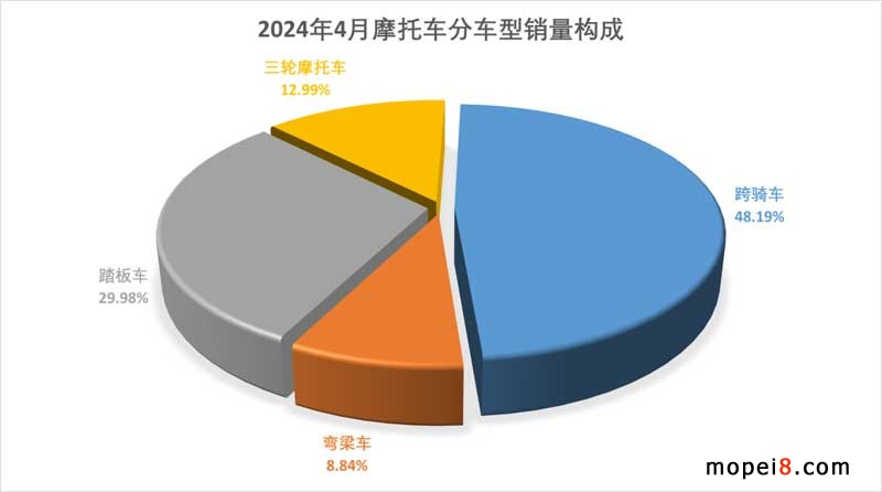 1-4月,跨騎車產(chǎn)銷289.03萬輛和286.07萬輛,同比增長22.19%和19.25%;踏板車產(chǎn)銷174.63萬輛和177.97萬輛,同比下降43.27%和36.88%;彎梁車產(chǎn)銷53.66萬輛和52.49萬輛,同比增長7.93%和4.32%。從各車型銷量占二輪車總銷量的比重看,跨騎、踏板和彎梁三類車型占比分別為55.38%、34.46%和10.16%。