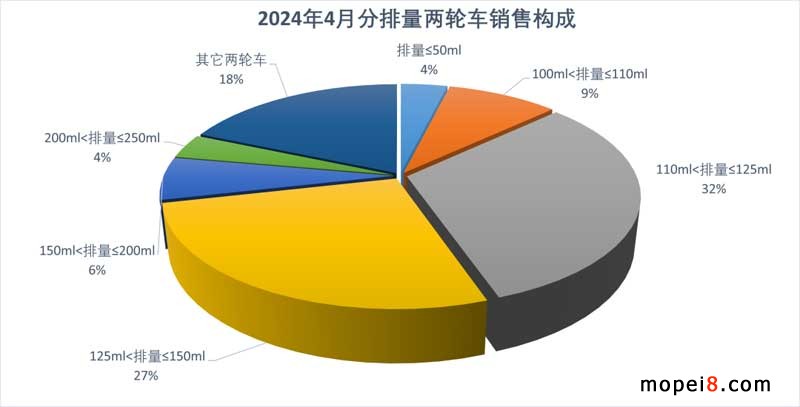 1-4月,50系列產(chǎn)銷20.3萬輛和19.95萬輛,產(chǎn)量同比增長3.03%,銷量同比下降5.8%;110系列產(chǎn)銷47.37萬輛和47.65萬輛,產(chǎn)銷量同比增長0.62%和2.6%;125系列產(chǎn)銷162.41萬輛和163.29萬輛,產(chǎn)銷量同比增長5.71%和5.42%;150系列產(chǎn)銷138.85萬輛和138.25萬輛,同比增長27.04%和25.85%;200系列產(chǎn)銷32.88萬輛和32.73萬輛,同比增長35.46%和32.65%;250系列產(chǎn)銷19.59萬輛和18.83萬輛,同比增長14.26%和14.11%。250cc以上大排量摩托車(不含250cc)產(chǎn)銷18.55萬輛和18.81萬輛,同比增長23.01%和15.26%。