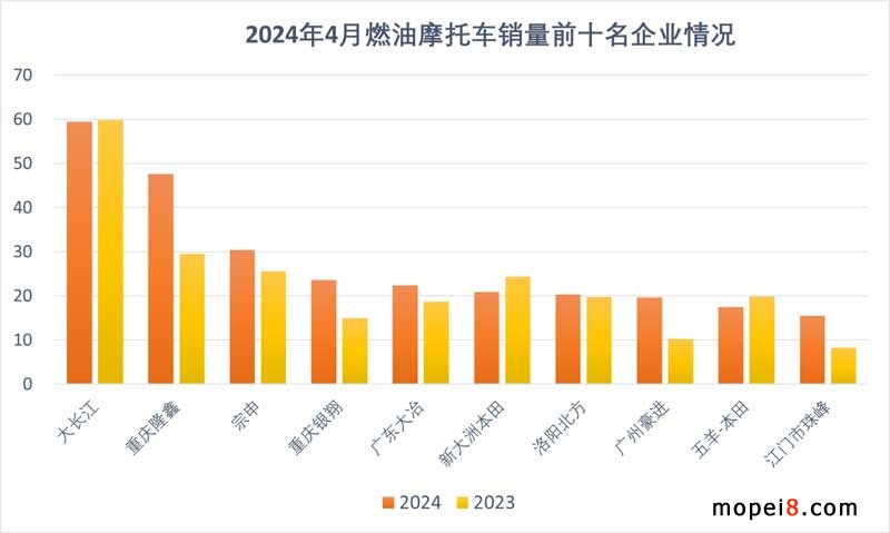 1-4月,燃油摩托車銷量前十名企業(yè)(集團(tuán))為大長江、隆鑫、宗申、重慶銀翔、廣東大冶、新大洲本田、洛陽北方、廣州豪進(jìn)、五羊-本田、江門市珠峰,分別銷售59.44萬輛、47.54萬輛、30.35萬輛、23.57萬輛、22.36萬輛、20.8萬輛、20.26萬輛、19.65萬輛、17.46萬輛和15.5萬輛。