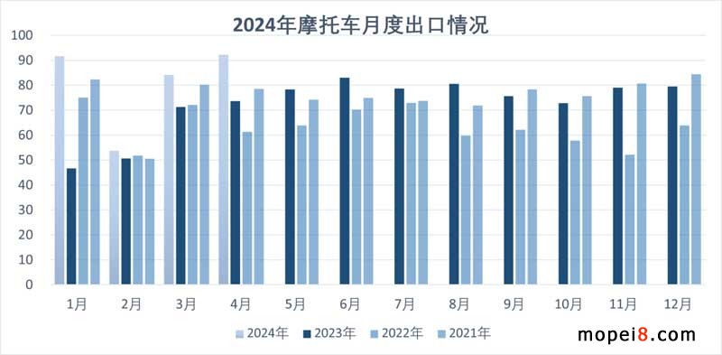 1-4月,摩托車生產(chǎn)企業(yè)產(chǎn)品出口總額25.88億美元,同比增長21.17%。整車出口量321.7萬輛,同比增長32.87%,出口金額20.6億美元,同比增長23.94%。摩托車發(fā)動機(jī)出口37.55萬臺,同比增長26.68%,出口金額0.86億美元,同比增長19.91%。沙灘車出口12.96萬輛,同比增長20.53%,出口金額3.27億美元,同比增長9.5%。摩托車零部件出口金額1.15億美元,同比增長11.2%。
