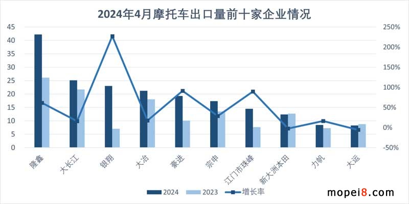 1-4月,摩托車出口量排名前十位的企業(yè)依次為:隆鑫、大長江、重慶銀翔、廣東大冶、廣州豪進(jìn)、宗申、江門市珠峰、新大洲本田、力帆、大運(yùn),上述十家企業(yè)共出口191.9萬輛,占摩托車出口總量的59.65%。