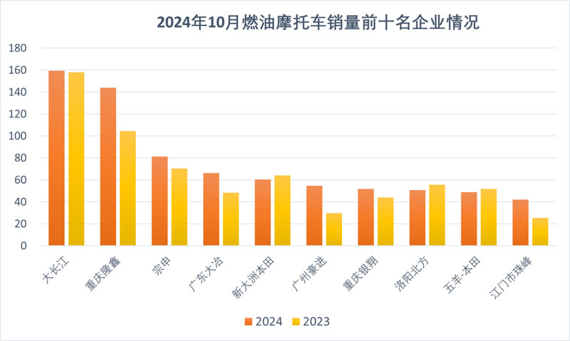 1-10月,燃油摩托車銷量前10名企業(yè)(集團)為大長江、隆鑫、宗申、廣東大冶、新大洲本田、廣州豪進、重慶銀翔、洛陽北方、五羊-本田、江門市珠峰,10家企業(yè)共銷售摩托車759.09萬輛,占摩托車總銷量的55.93%。