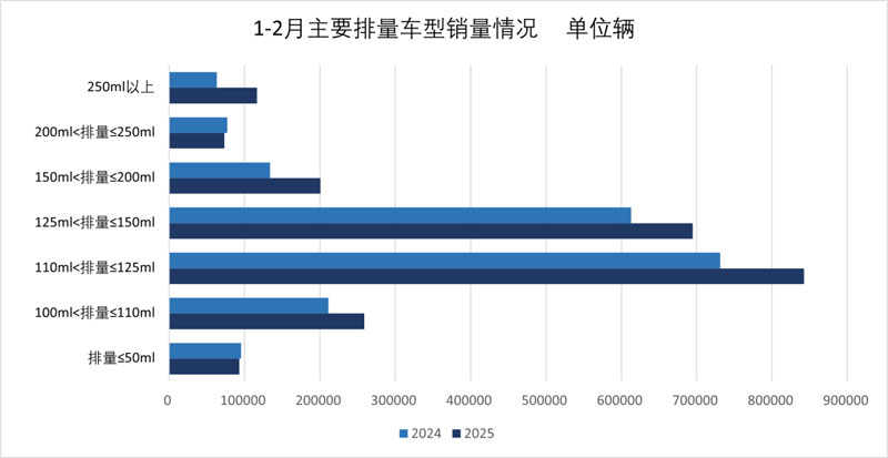 2月,出口量位居前六位的系列品種為:125系列(110ml<排量≤125ml)、150系列(125ml<排量≤150ml)、110系列(100ml<排量≤110ml)、200系列(150ml<排量≤200ml)、50系列(排量≤50ml)和250系列(200ml<排量≤250ml),分別出口25.53萬輛、19.34萬輛、8.66萬輛、8.08萬輛、2.7萬輛、2.53萬輛。與去年同期相比,125系列增長56.63%,150系列增長24.28%,110系列增長33.52%,200系列同比增長58.05%,50系列增長20.05%,250系列增長12.14%。