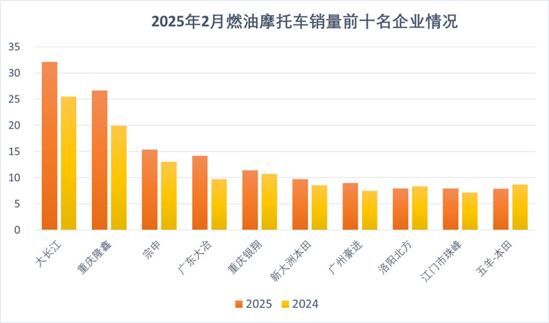 1-2月,燃油摩托車銷量前10名企業(集團)為大長江、隆鑫、宗申、廣東大冶、重慶銀翔、新大洲本田、廣州豪進、洛陽北方、江門市珠峰、五羊-本田,分別銷售摩托車32.09萬輛、26.66萬輛、15.39萬輛、14.18萬輛、11.4萬輛、9.74萬輛、9萬輛、7.96萬輛、7.92萬輛、7.9萬輛,10家企業共銷售摩托車142.22萬輛,占摩托車總銷量的56.47%。