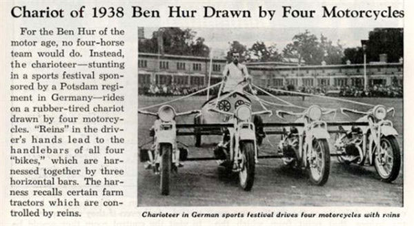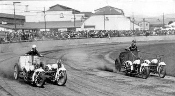 摩托車戰(zhàn)車,很像古羅馬時(shí)期的車展。這種比賽在1920年代達(dá)到了頂峰,此后一直持續(xù)到1930年代才逐漸衰落。遺憾的是,當(dāng)時(shí)的比賽選手是如何駕馭這樣的戰(zhàn)車的,目前已經(jīng)沒人能夠搞明白了。比如有的戰(zhàn)車手,能夠同時(shí)駕馭四輛摩托車組成的戰(zhàn)車。