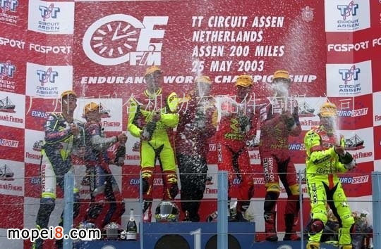 2003年 第二站荷蘭亞森宗申車隊奪冠后,車手們在頒獎臺上忘情地噴灑香檳