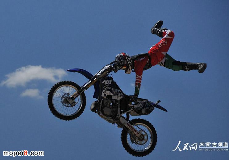 開幕式上,精彩絕倫的國際摩托車頂級極限表演賽首次亮相內蒙古草原。炫目的車技使現場觀眾不斷爆發出歡呼聲、喝彩聲。