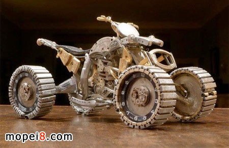 加拿大藝術(shù)家 Dan Tanenbaum 將回收的舊鐘表零件進(jìn)行重新組合,變成一臺(tái)臺(tái)拉風(fēng)的摩托車(chē)模型。