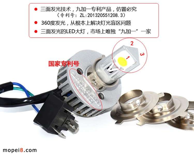 1.九加一專(zhuān)利產(chǎn)品,專(zhuān)利號(hào):ZL:201320551208.3,360度三面發(fā)光(近光兩面亮,遠(yuǎn)光三面亮),配合原車(chē)燈杯反射,光利用率提升30%,瞬間啟動(dòng),從根本解決燈光盲區(qū)。特殊材質(zhì),解決高溫散熱問(wèn)題。