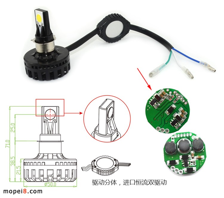 8.本燈為直流供電,用在直流摩托車或大燈端電壓為12V的電動車上;如果是交流車,或者大燈端電壓高于12V的電動車就不能用。
