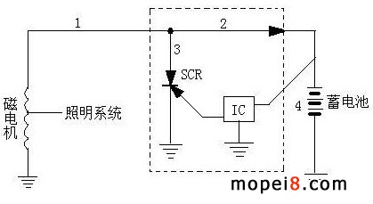 當磁電機輸出電壓在正半周時,電壓瞬時值超過蓄電池電壓,電流流經1通過2直通二極管,而IC(充電電流控制裝置)發送信號使可控硅SCR阻止電流從3流過4處。這樣蓄電池就直接充電。當輸出電壓增大時,IC發出信號,使可控硅SCR的導通角減少,從而控制了充電的電流,有效地防止了蓄電池過度充電。