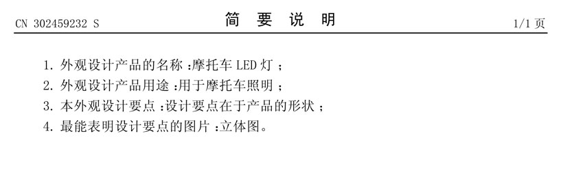 簡要說明: 1.外觀設計產品的名稱:摩托車LED燈; 2.外觀設計產品用途:用于摩托車照明; 3.本外觀設計要點:設計要點在于產品的形狀; 4.最能表明設計要點的圖片:立體圖。 |