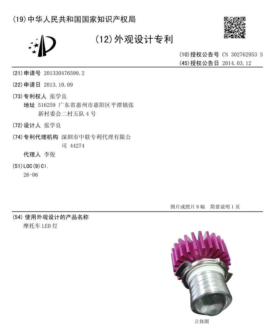 簡(jiǎn)要說(shuō)明: 1.本外觀設(shè)計(jì)產(chǎn)品的名稱:摩托車LED燈。2.本外觀設(shè)計(jì)產(chǎn)品的用途:本外觀設(shè)計(jì)產(chǎn)品用于照明。3.本外觀設(shè)計(jì)產(chǎn)品的設(shè)計(jì)要點(diǎn):在于產(chǎn)品的整個(gè)設(shè)計(jì)。4.最能表明本外觀設(shè)計(jì)設(shè)計(jì)要點(diǎn)的圖片或照片:立體圖。 |