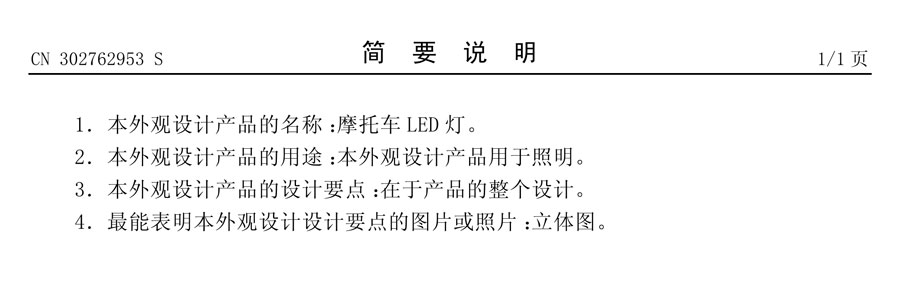 簡要說明: 1.本外觀設計產品的名稱:摩托車LED燈。2.本外觀設計產品的用途:本外觀設計產品用于照明。3.本外觀設計產品的設計要點:在于產品的整個設計。4.最能表明本外觀設計設計要點的圖片或照片:立體圖。 |